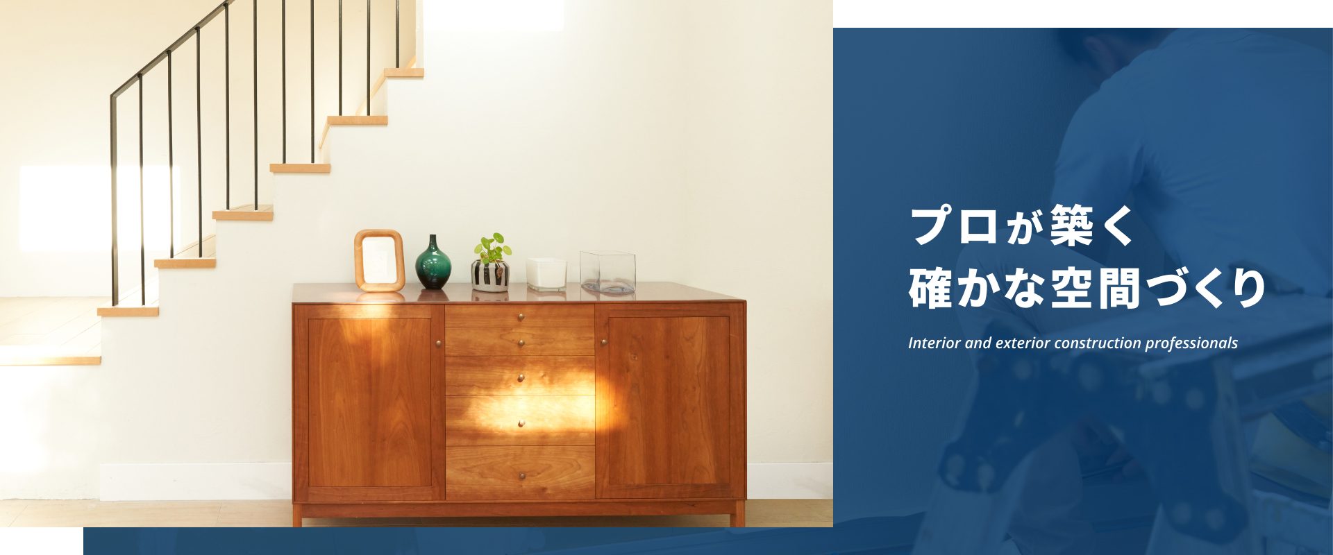 私たちは、内装・外装工事全般において、軽鉄・ボードから造作大工まで一貫したサービスを提供します。お客様のあらゆるニーズにノンストップでお応えし、ご要望に応じた別注家具も手がけます。プロフェッショナルとしての誇りを持ち、高い技術力で信頼に応える空間づくりをお約束いたします。